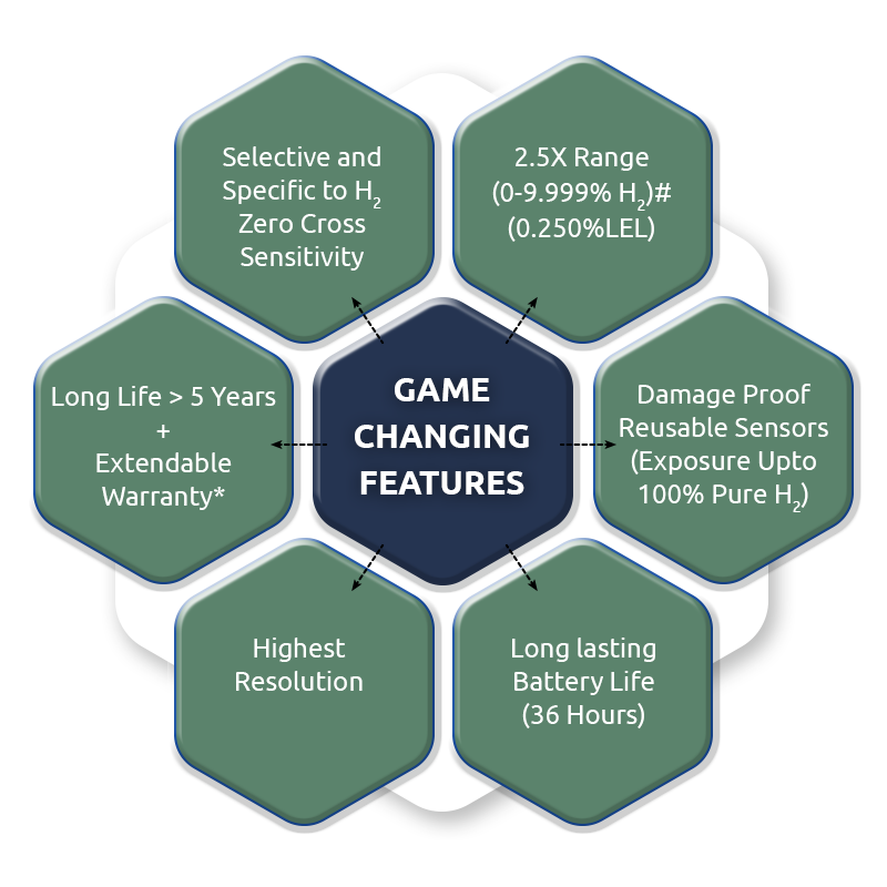 It is specific, selective and intelligent to Hydrogen and does not get permanently damaged upon exposure to the high concentration of hydrogen, allowing a very wide, industry-leading measurement range.